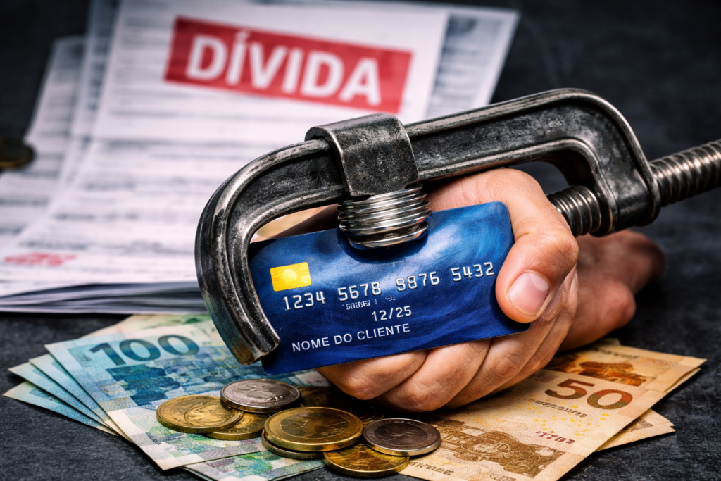 Os números ajudam a explicar a gravidade do quadro. Em janeiro, o juro médio do rotativo do cartão de crédito ficou em 424,5% ao ano, mantendo a modalidade entre as mais caras do mercado financeiro brasileiro. Mesmo com recuo em relação ao mês anterior, o patamar continua extremamente elevado e reforça a pressão sobre famílias que não conseguem quitar o valor integral da fatura.