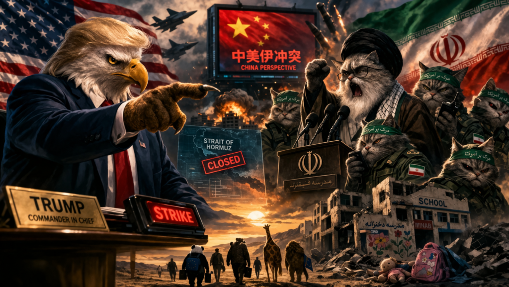 No vídeo, o ex-presidente Donald Trump é representado como uma águia — símbolo tradicional dos EUA — enquanto os iranianos aparecem como gatos, em referência à origem persa predominante no país. A narrativa inclui cenas simbólicas de ataques, promessas de retaliação e até o fechamento do Estreito de Ormuz, rota estratégica para o comércio global.