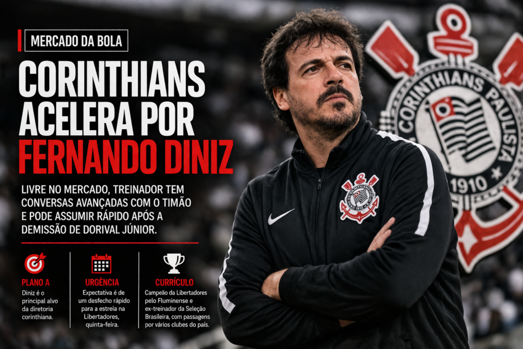 O Corinthians se movimenta nos bastidores para definir rapidamente seu novo comandante. Após a demissão de Dorival Júnior, o nome de Fernando Diniz ganhou força e já é tratado como prioridade absoluta pela diretoria alvinegra.